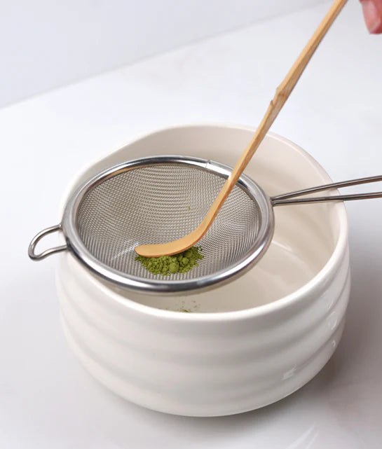 Siebe den Matcha durch ein feines Sieb, um Klümpchen zu vermeiden.
