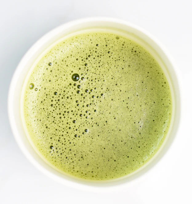 Schlage den Matcha mit dem Chasen (Bambusbesen)in schnellen „M“- oder „W“-Bewegungen schaumig, bis eine feine, gleichmäßige Crema entsteht.